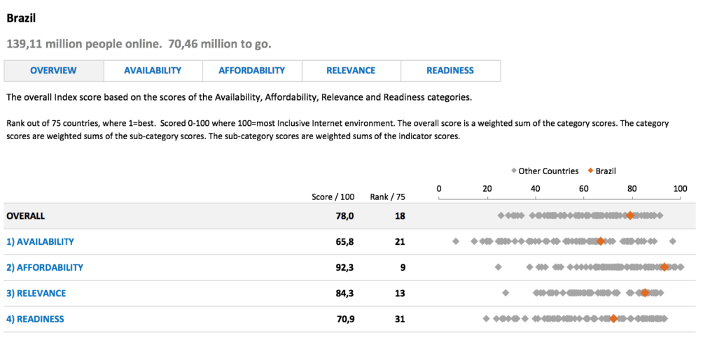 “A conectividade não é apenas um subproduto do progresso – é um elemento decisivo”, aponta o estudo The Inclusive Internet: Mapping Progress 2017 (A Internet Inclusiva: Mapeando o Progresso 2017)¹. Nele, os países foram classificados em quatro categorias de conectividade: disponibilidade, acessibilidade, relevância e prontidão. O Brasil ficou com a 18º colocação, entre os 75 países estudados.